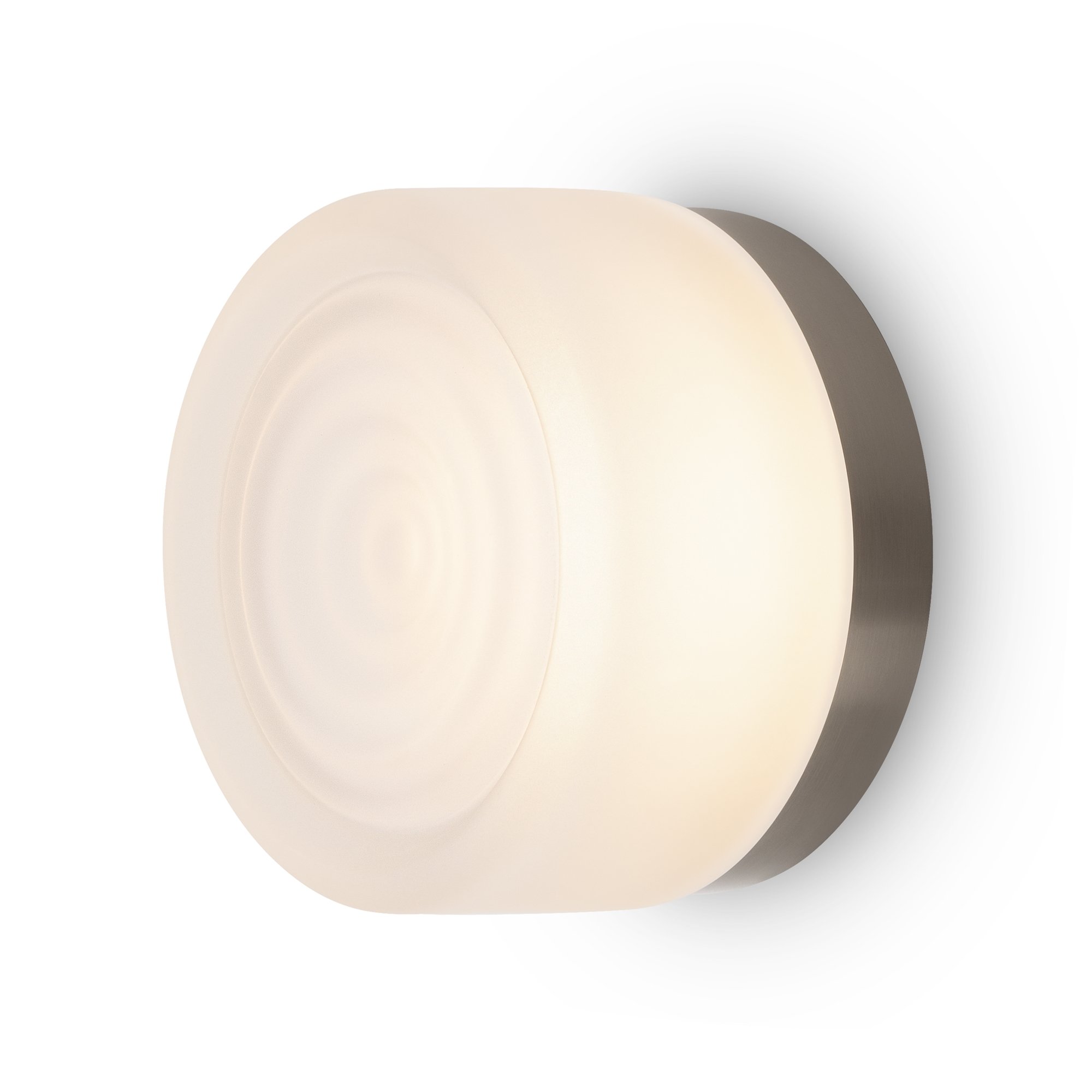 Металлическая арматура в цвете никель в трех рельефных основаниях. Плафоны, выполненные в приглушенно пшеничном и янтарном оттенках, доступны в двух размерах. LED источник света 2400К/2550К/3000K.