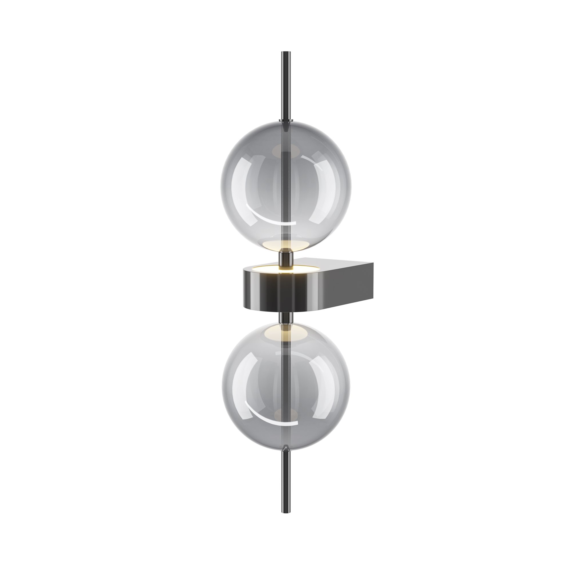 Серия Double Moon включает подвесные светильники, бра, напольные и аккумуляторные настольные модели. Ключевой элемент — стеклянные шары с тонированным зеркальным градиентом, создающие эффект парящих небесных тел. Подсветка реализована через LED-источники 3000K, скрытые за матовыми рассеивателями для мягкого свечения. Конструктивные особенности: магнитные потолочные чаши у подвесов и магнитные накладки у бра, обеспечивающие бесшовный монтаж без видимого крепежа. Серия отмечена премиями Red Dot и A’design за инновационный дизайн. Вдохновлена астрономическим феноменом двойной луны 2024 года. Рекомендуется для современных интерьеров с космической эстетикой. Сочетает художественную концепцию с передовыми технологиями монтажа.
