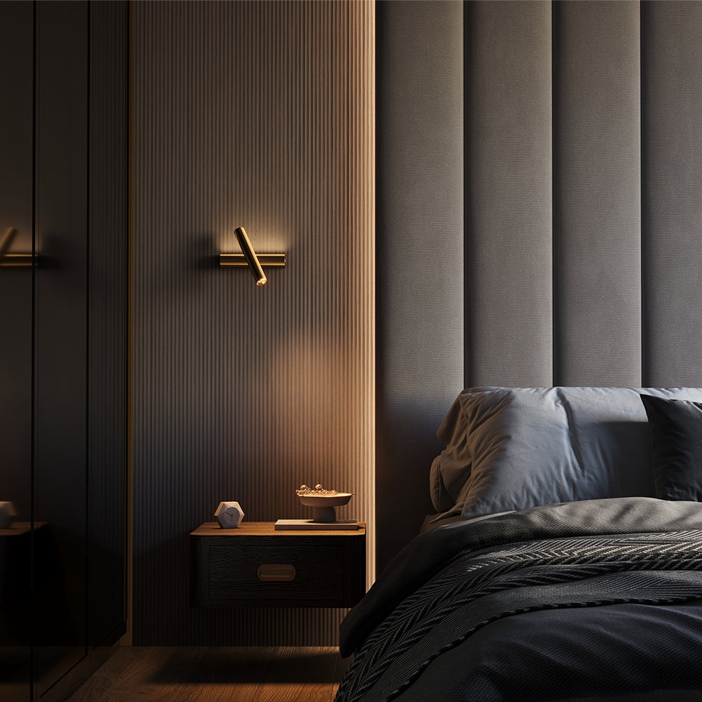 Футуристичный цилиндрический дизайн. Создает как общее заливающее освещение, так и точечную подсветку. Арматура: алюминий; цвет: черный, латунь. Два независимых LED-источника 3000K: скрытая лента с матовым рассеивателем для переотраженного света и поворотный спот для направленного освещения. Углы поворота спота: 350° по горизонтали и 90° по вертикали. Сенсорное управление на корпусе с раздельным включением и диммированием. Для современных интерьеров гостиных, кабинетов и спален.