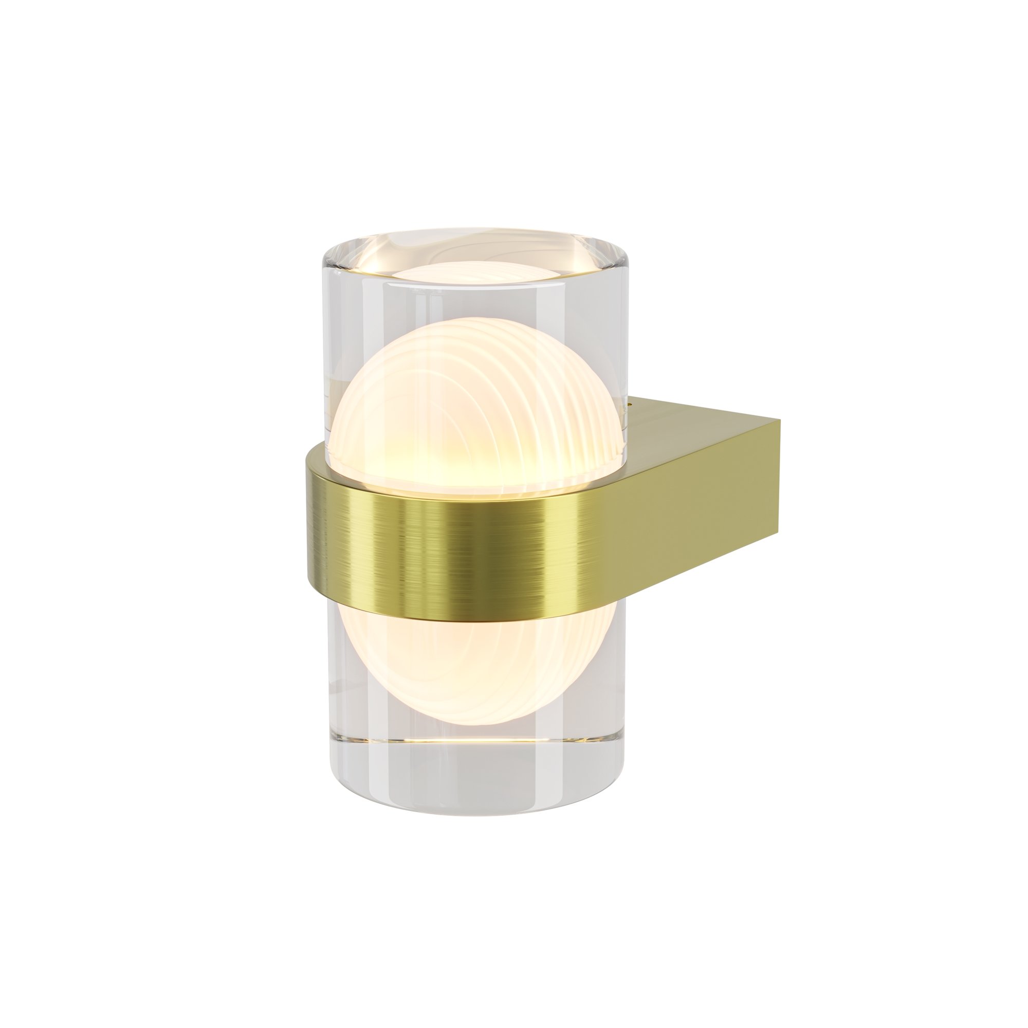 Плафоны из литого стекла, в котором изнутри вырезана и заматирована полусфера. Металлическое основание в цвете сатинированной латуни. Шестигранники вместо стандартных монтажных болтов устраняют визуальный шум. Стеклянные элементы можно вращать, меняя рисунок светового узора. Бра на два плафона можно закрепить вертикально или горизонтально, а модель с одним плафоном использовать как настенный или накладной потолочный светильник. Мягкий ореол света обеспечивает LED-источник (3000К).