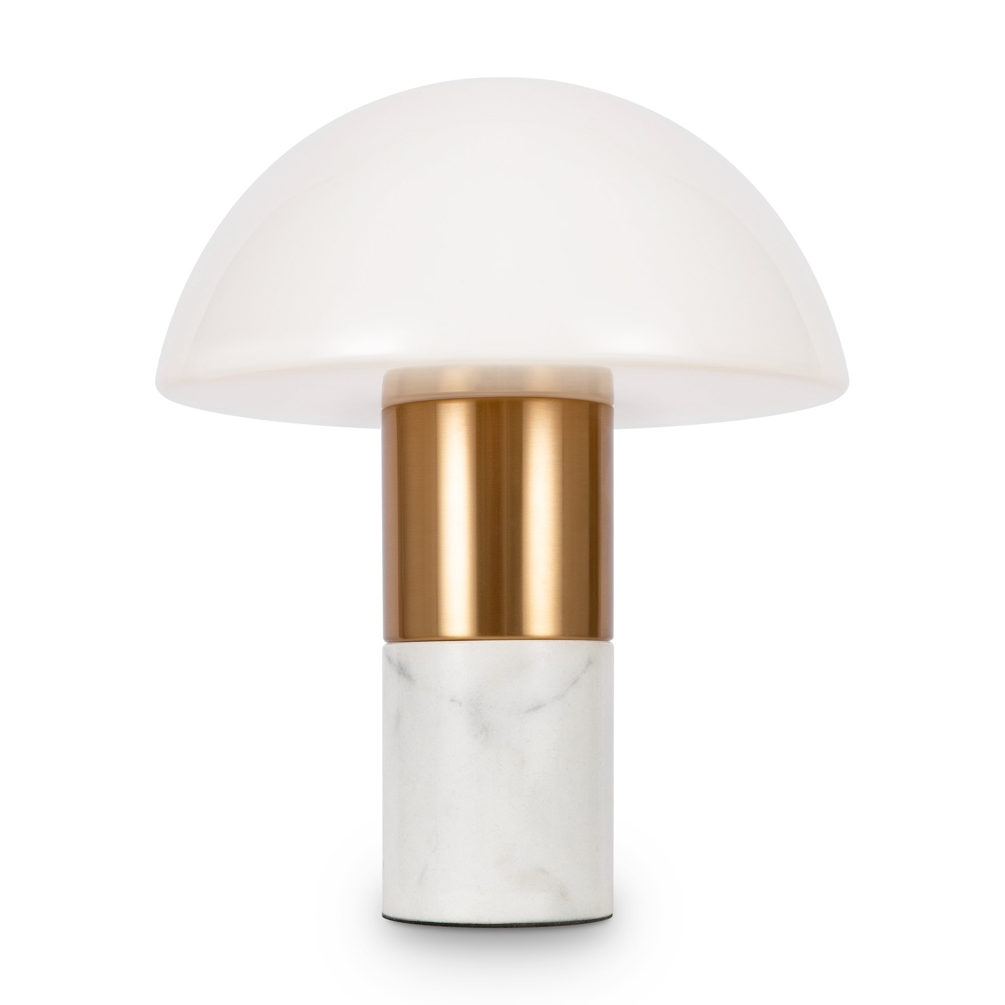 Материал арматуры — метал, цвет — латунь. Основание - белый мрамор с серым рисунком. Плафон из глянцевого стекла в форме полушара. Источник света — лампа с цоколем E14