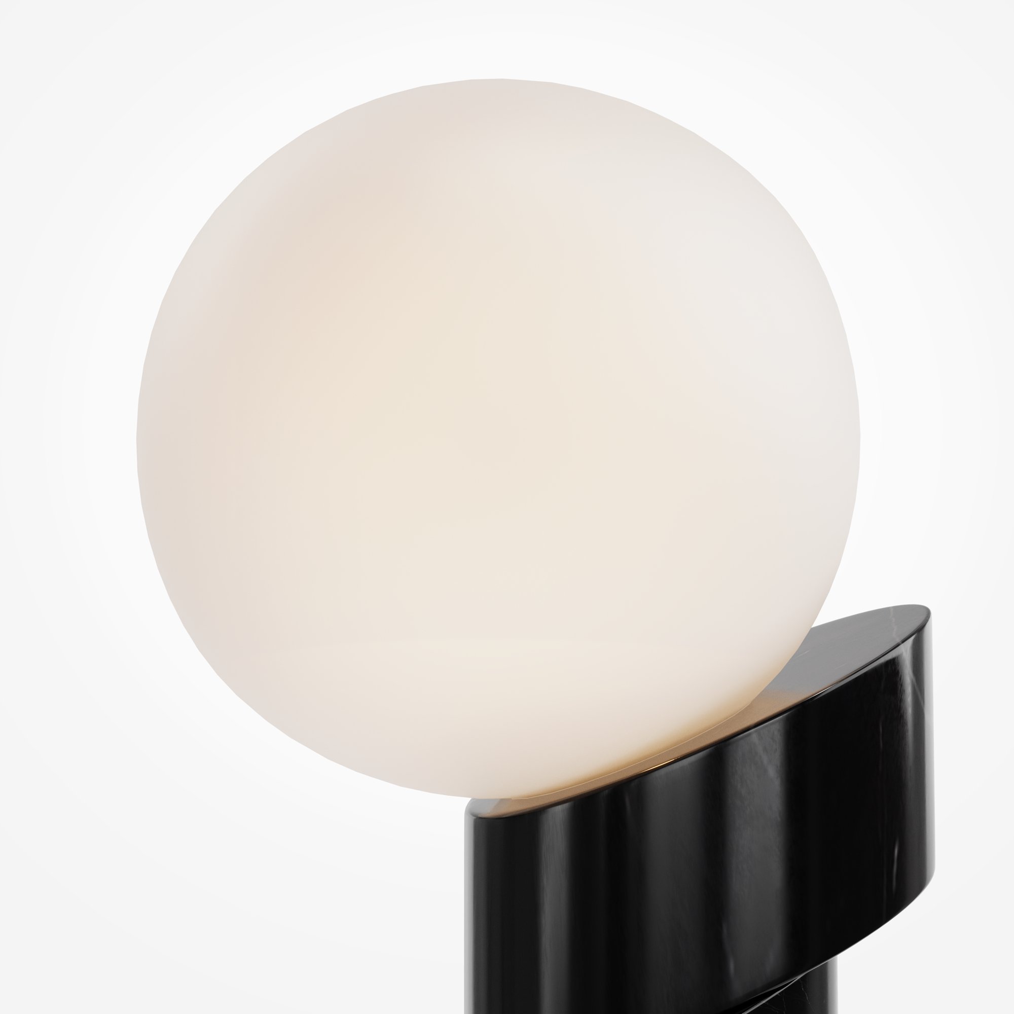 Настольный светильник с асимметричным дизайном. Основание из натурального черного мрамора с уникальным рисунком обеспечивает устойчивость. Матовый стеклянный плафон-шар скрывает LED-источник 3000K, создающий мягкое рассеянное освещение. Сенсорный выключатель на основании с функцией диммирования. Арматура из металла. Сочетание монументальности мрамора и современного дизайна. Рекомендуется для гостиных, кабинетов и столовых зон. Габариты и вес оптимизированы для настольного использования.