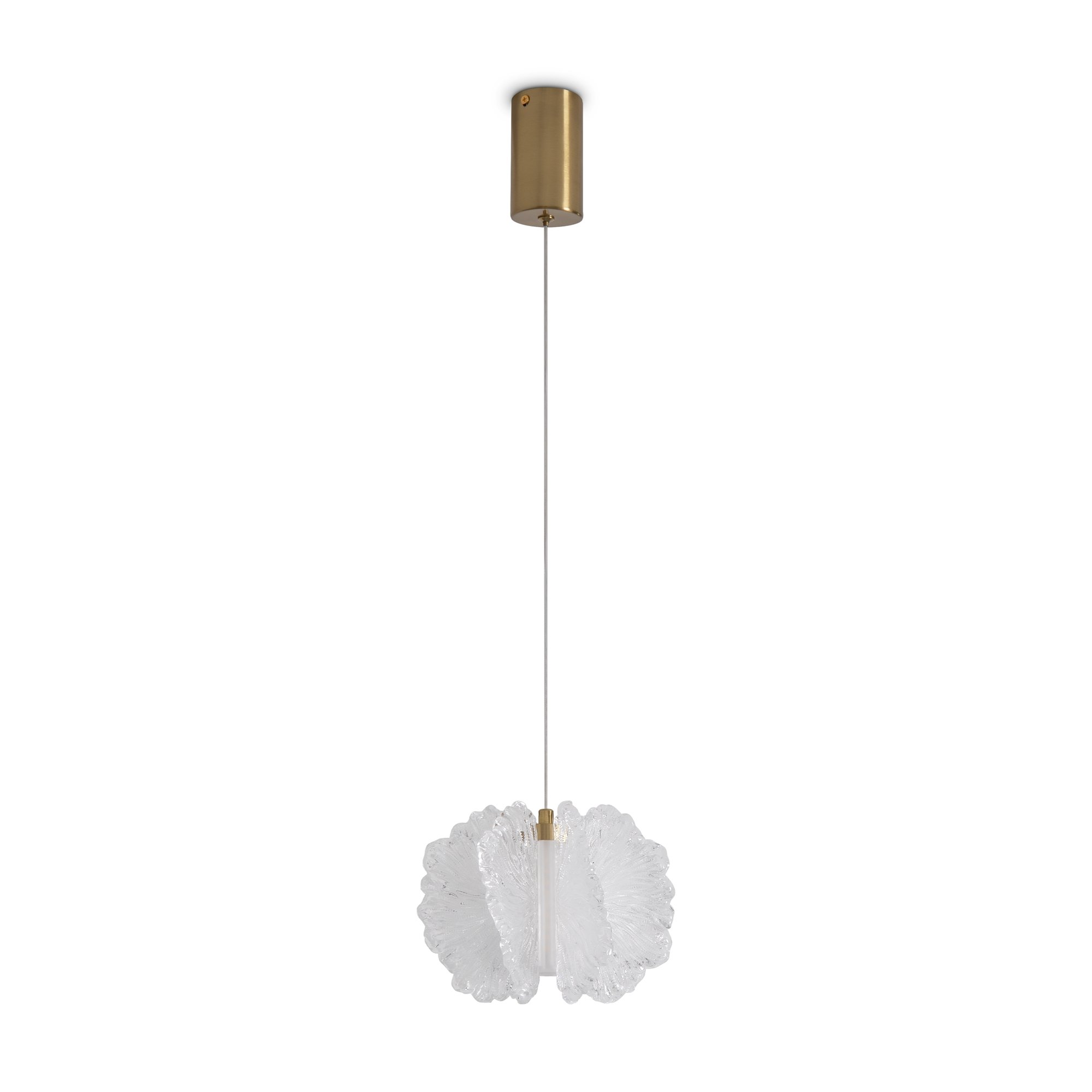 Подвесные светильники Flower: воздушные акриловые плафоны на металле. Встроенные LED (2700K), угол рассеивания 120°. Высота 1200 мм. Два варианта подвесов: каскадный и одинарный.