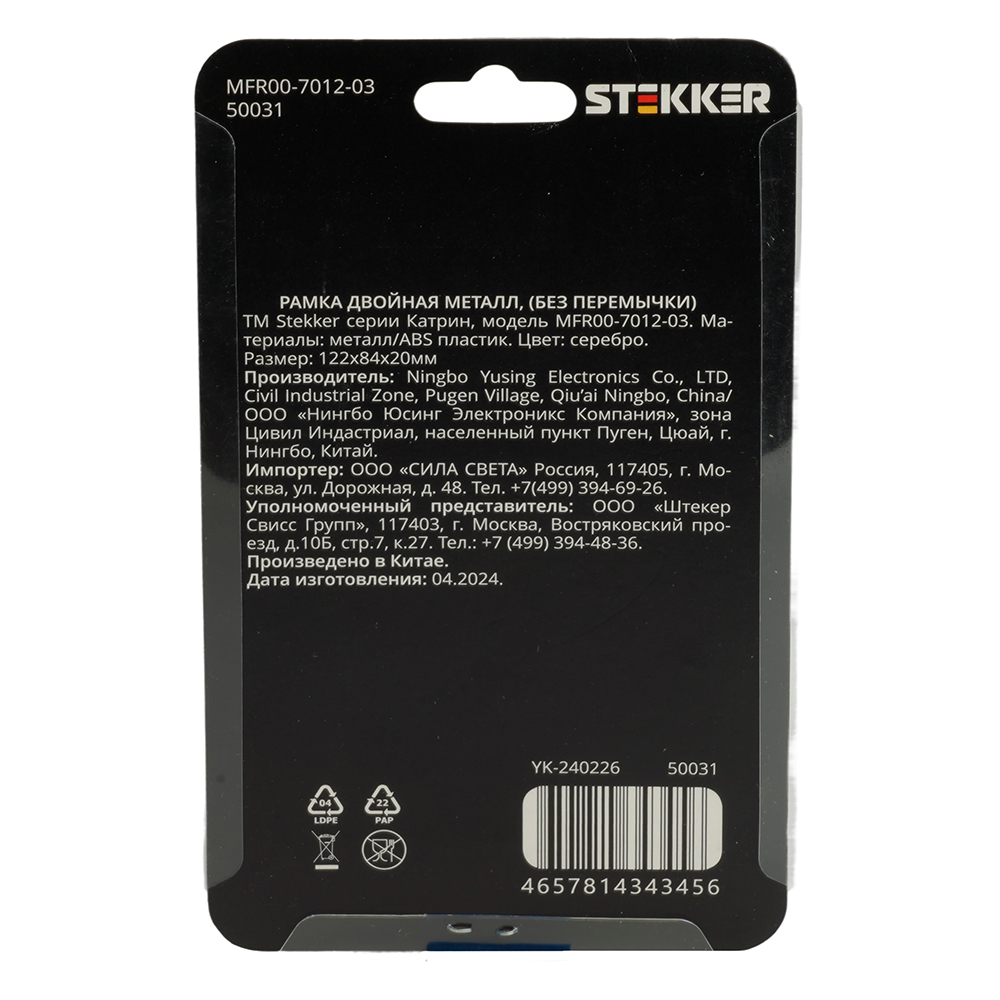 Рамка STEKKER MFR00-7012-03 на гнездо, , . Материал: металл/ABS пластик, цвет серебро, размер 122*84*20мм. Номинальное напряжение , номинальный ток , диапазон рабочих температур ,