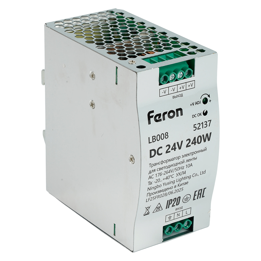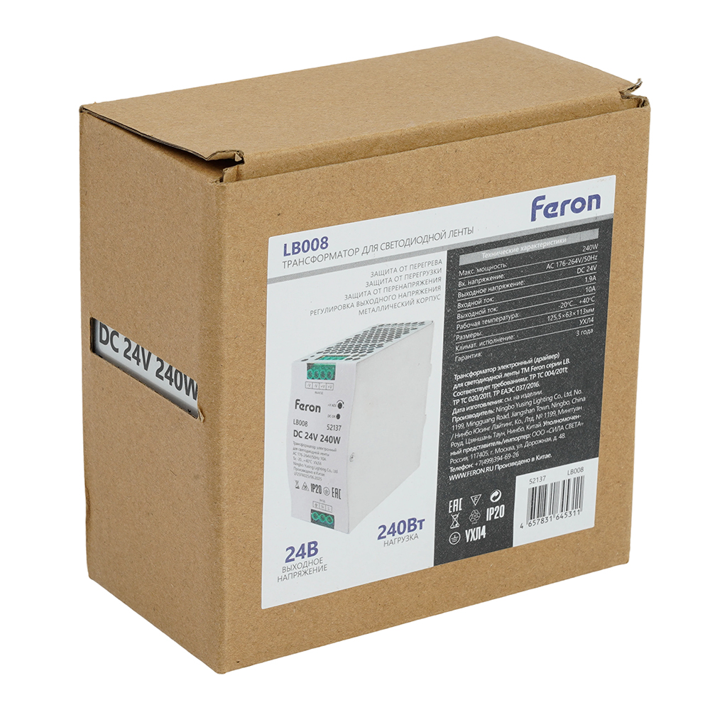 LB008 Трансформатор электронный для светодиодной ленты на DIN-рейку 240W 24V 63*125.5*113мм IP20